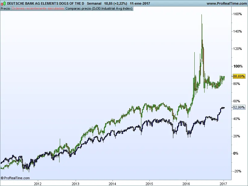 Los Etfs son fondos que cotizan en bolsa como una acción, hay muchos y de todas clases. Hace un tiempo ya comenté uno que me gustaba para entrar, el «DOD», creo que fue en junio, cuando la señal de Coppock se activó en USA. El DOD se basa en la conocida técnica de los perros del Dow, es decir, los 10 valores con mayor rentabilidad por dividendo del Dow. Aquí está comparado con el Dow Jones Industriales.