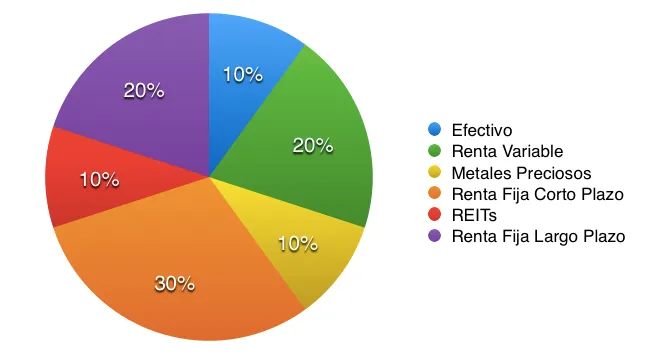 Ejemplo de posición estratégica de una cartera moderadamente conservadora. Cada una de esas piezas fundamentales puede subdividirse a su vez en distintas subpartes. Así, la pata de renta variable por ejemplo, podría subdividirse en 10% Europa, 5% USA y 5% Mercados emergentes por ejemplo.