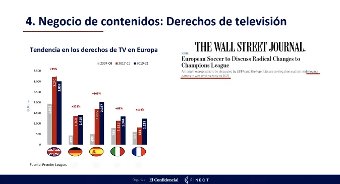 “El fútbol europeo es un negocio que bien gestionado tiene un potencial extraordinario”, explicó el experto, quién argumentó que uno de los motivos principales de este potencial es que dichas compañías tienen una alta importancia para el consumidor y su coste para el mismo es relativamente bajo.