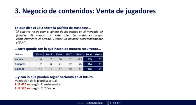 La compra-venta de jugadores es otro componente importante de la compañía, que tiene la filosofía que tiene de fichar jugadores jóvenes y baratos para posteriormente venderlos a un precio superior. La principal diferencia de este club es que no se la gastan de nuevo en jugadores si no que, como comenta García Álvarez, “la venta de jugadores es una parte recurrente del margen y se busca tener un balance extremadamente sólido”. Actualmente el valor de su plantilla es de 420 millones de euros.
