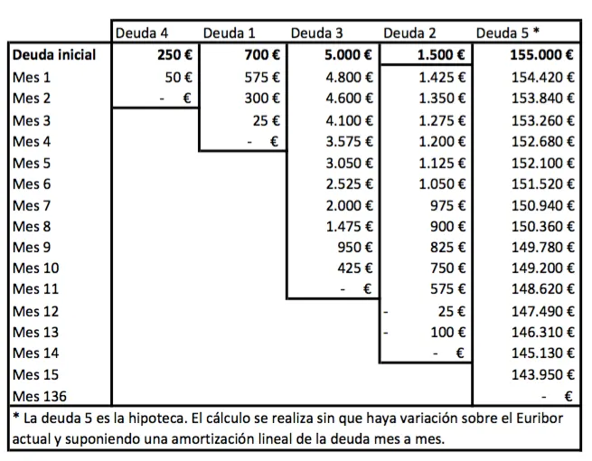 En este caso empezará por la de menor interés porque en dos meses estará liquidada, liberando 50 euros más para acelerar el pago de la deuda. De hecho, en segundo mes ya podrá empezar a amortizar la segunda deuda de forma anticipada. Además, servirá darle confianza en la estrategia elegida. Este cuatro resume cómo irá pagando la deuda y cuándo terminará de hacerlo.