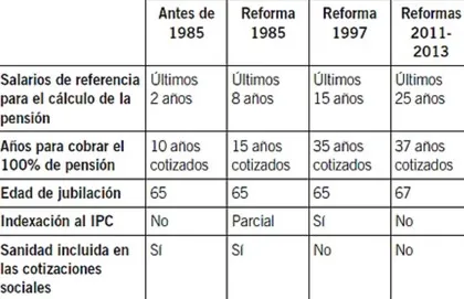 Los primeros cambios de la reforma de las pensiones fueron aumentar la edad de jubilación y el número de años que tienen en cuenta para calcular la cuantía de la jubilación. Estos irán creciendo paulatinamente hasta 2027 cuando todo el mundo se jubilará a los 67 años. Además, a partir de 2022 se tendrán en cuenta los últimos 25 años para establecer la base reguladora de la pensión.