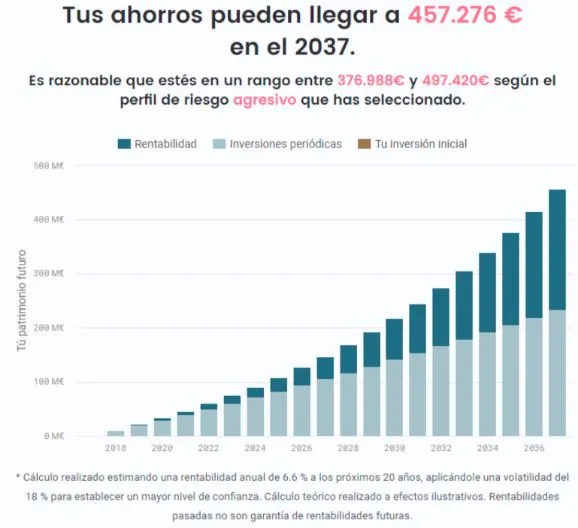 El dinero restante será lo que dispongas para invertir y rentabilizar. Supongamos que estamos hablando de una vivienda por las que has obtenido 200.000 euros. Si inviertes ese capital con un perfil de riesgo agresivo en 2037 podrás tener 718.082 euros en tu cuenta. Aquí puedes hacer cálculos con lo que obtendrías a largo plazo según el riesgo que asumas.