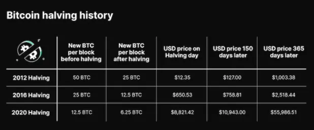 La siguiente tabla elaborada por Bitpanda muestra cómo ha evolucionado BTC después de cada halving: