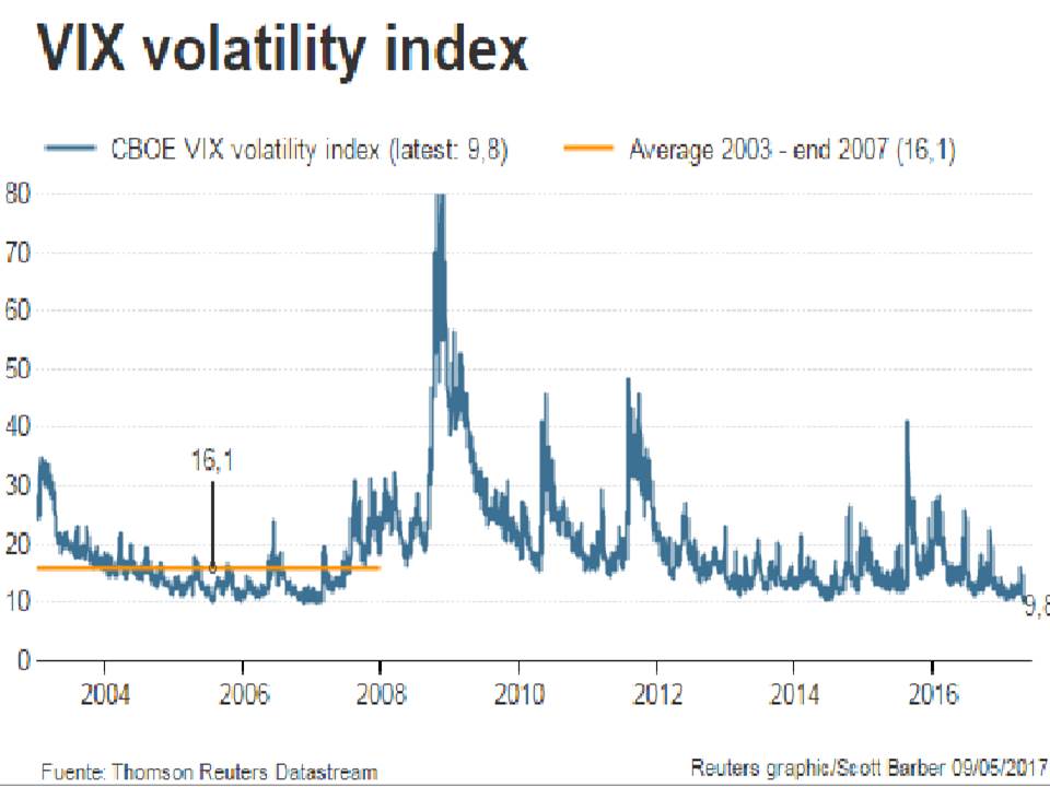 · El índice VIX (popularmente conocido como índice del miedo y que, dicho a la pata la llana, mide la volatilidad esperada por el mercado para el índice de Bolsa S&P 500 a treinta días vista) ha bajado a 9,8 que es su nivel mínimo desde diciembre de 1993 en que cayó a 9,31. Refleja, por tanto, algo bien sabido: la confianza extrema que se ha instalado en los mercados de renta variable (recuérdese que en octubre de 2008, tras caer Lehman Brothers, el VIX subió hasta cerca de 90, aunque cerrara finalmente en 81).