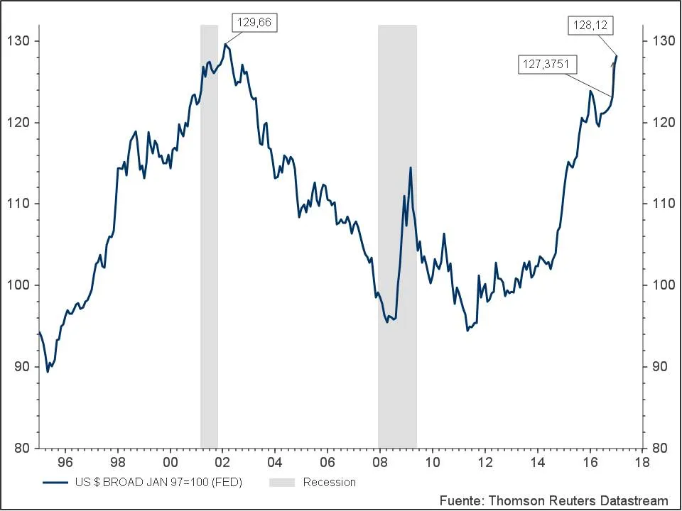 Los tipos de interés reales del dólar a largo plazo (diez años) lo más probable es que se mantengan en el intervalo de 2016 que va de cero a 0,70%, con tendencia a la baja y sin descartar que entren en terreno negativo. Eso significaría que la inflación está creciendo más que la subida de los tipos nominales, cosa que podría ocurrir perfectamente en EEUU con las medidas proteccionistas (que aumentarían los precios interiores) con la tendencia alcista del precio de las materias primas y con la situación de pleno empleo de que goza EEUU (con costes salariales al alza) que no aliviará una política llamada a restringir la llegada de inmigrantes.