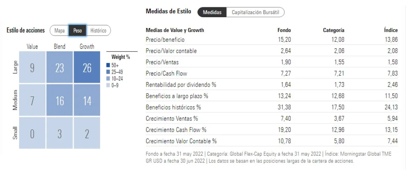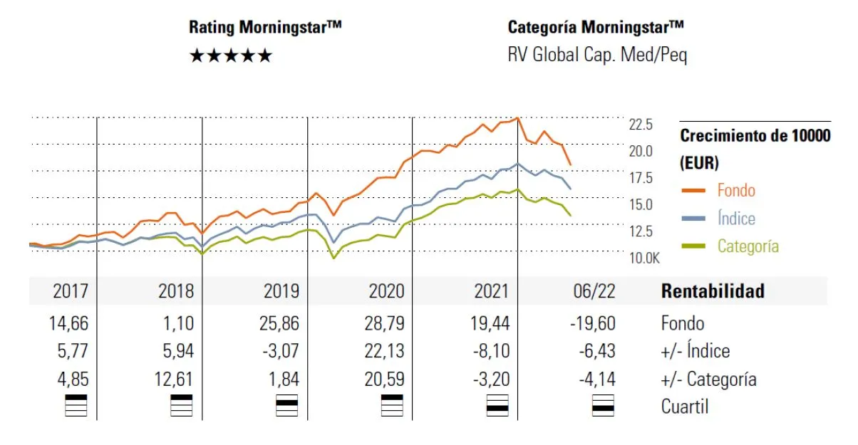 Hasta final de junio de 2022, el fondo ha obtenido una rentabilidad acumulada del 79,80%, frente al 58.41% de su índice de referencia (el MSCI AC World). En términos anualizados, el fondo ha obtenido un 11,09% anual frente al 8.63% del índice. Si bien es cierto que este año está sufriendo más -19,60% vs -13,18% por la gran rotación que ha habido hacia sectores más defensivos.