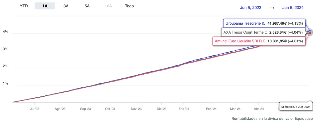 - Groupama Trésorerie: un clásico entre los monetarios, que se puede encontrar además en algunas plataformas de fondos con unos gastos corrientes del 0,07%. Su rentabilidad a 1 años se eleva hasta el 4,11%, como se puede ver en su ficha.