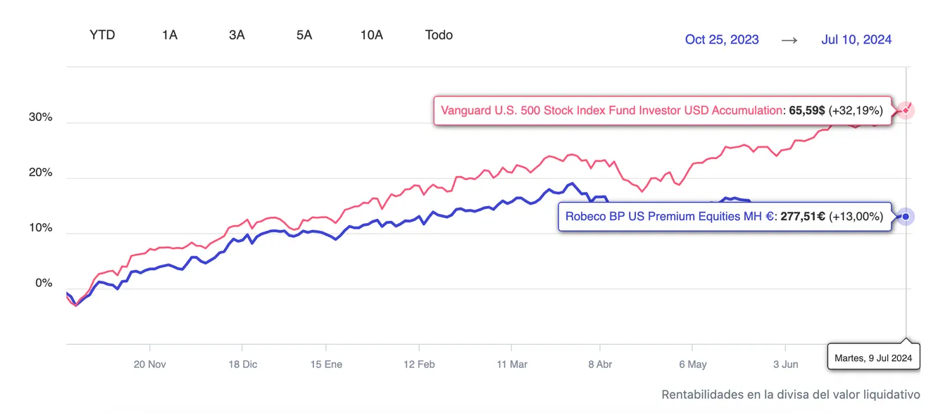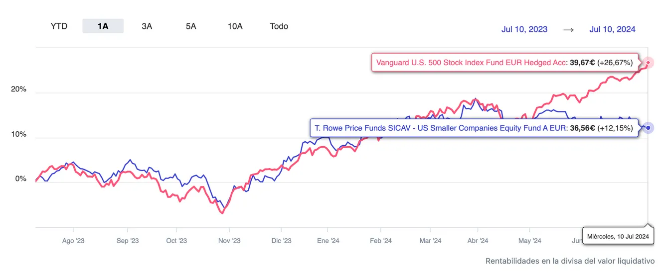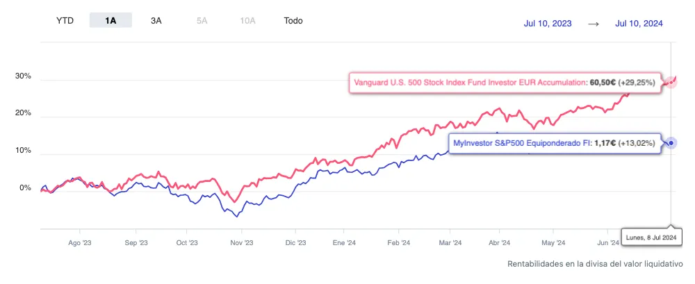 Por ejemplo, el MyInvestor S&P500 Equiponderado apenas sube un 6% en lo que va de año, una fracción de las fuertes ganancias del S&P 500. A 12 meses, un indexado sobre el S&P 500 normal más que duplica la rentabilidad del fondo equiponderado.