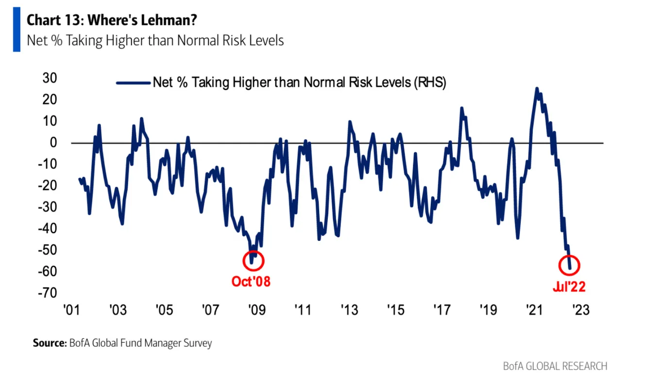Como muestra este gráfico de la última encuesta de gestores de Bank of America, había más pesimistas este julio en el mercado que tras la caída de Lehman Brothers, como se refleja en el hecho de que la enorme mayoría de gestores institucionales estaba tomando menos riesgo de lo normal en cartera.