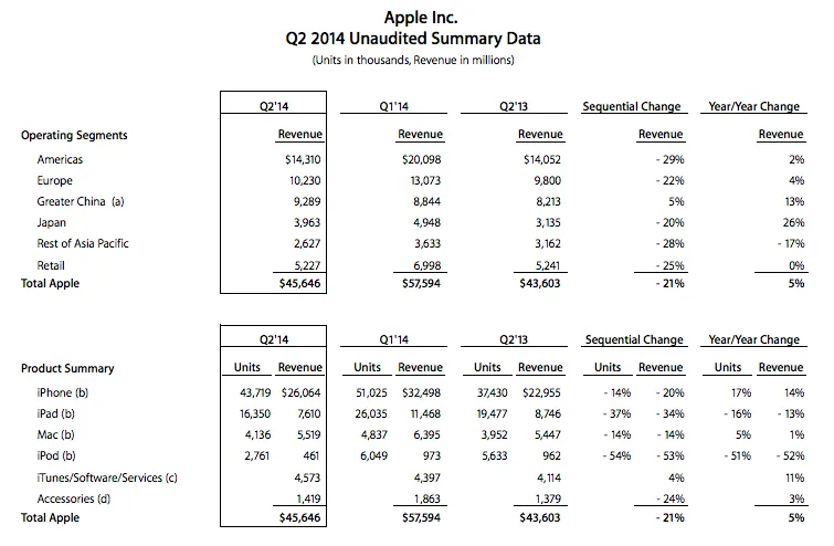 El negocio del iPod, totalmente canibalizado por el iPhone, sigue desplomándose mientras que los iMac tienen un leve crecimiento. Por su parte, los negocios relacionados con compra de música/películas/aplicaciones siguen un sano crecimiento superior al 10% y se acercan ya a los 5.000 millones de dólares en el trimestre.