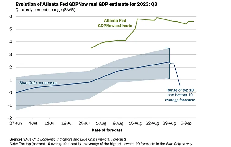 Por ahora, parece que las cifras le dan la razón. EEUU tan sólo entró en una exigua recesión técnica en 2022, de la que salió rápido. Este verano incluso hay señales que apuntan a una renovada fortaleza. El índice GDPNow que elabora la Fed de Atlanta estima ahora un sorprendente crecimiento interanual del 5,6% para el tercer trimestre, a partir de los datos adelantados de actividad que mide. Muy por encima de las expectativas del consenso.