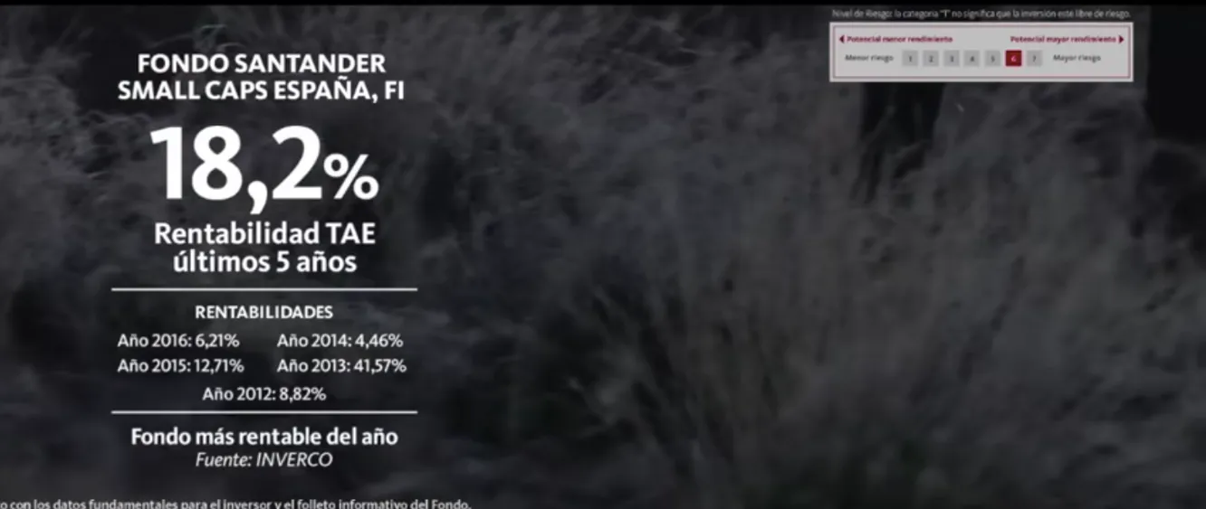 Hace justo un año, sucedía algo histórico en el mundo de los fondos de inversión. Un fondo de renta variable protagonizaba uno de los primeros anuncios tras las campanadas de Nochevieja. Se trataba del Santander Small Caps España que gestiona Lola Solana, un producto que por aquel entonces tenía unas rentabilidad astronómicas a distintos plazos, como se mostraba en el propio anunicio, por encima del 18% a 5 años.