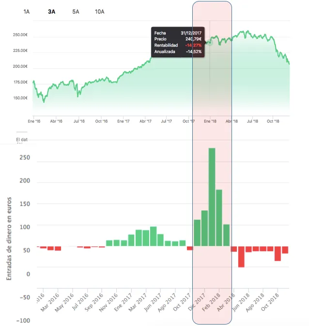 El gráfico habla por sí mismo. La parte de arriba es la evolución del valor liquidativo del fondo. La de abajo, las entradas y salidas netas mensuales. Como se puede ver, más de la mitad entró en las semanas previas a que el Santander Small Caps marcara máximos históricos y empezara a caer.