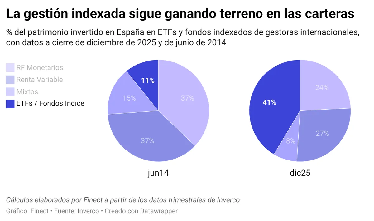 Lo significativo es que los ETFs ya suponen el 41,4% del total del patrimonio de las IICs internacionales en España. Y hace una década, apenas el 11%. Es decir, casi 4 veces más. De cada 100 euros invertidos en fondos internacionales, más de 41 ya están en gestión indexada.