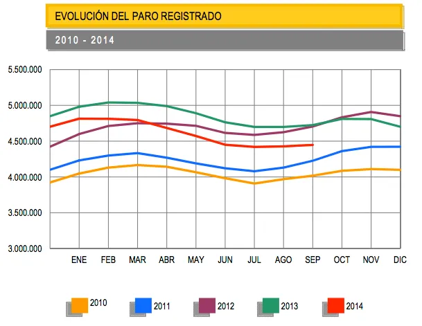 Lo cierto, como se puede ver, es que de momento estos meses la curva (la línea roja es la de 2014) apenas ha girado al alza, prácticamente se mantiene plana, al pasar la temporada de verano, como sí ocurría en los años previos. Y eso está bien.