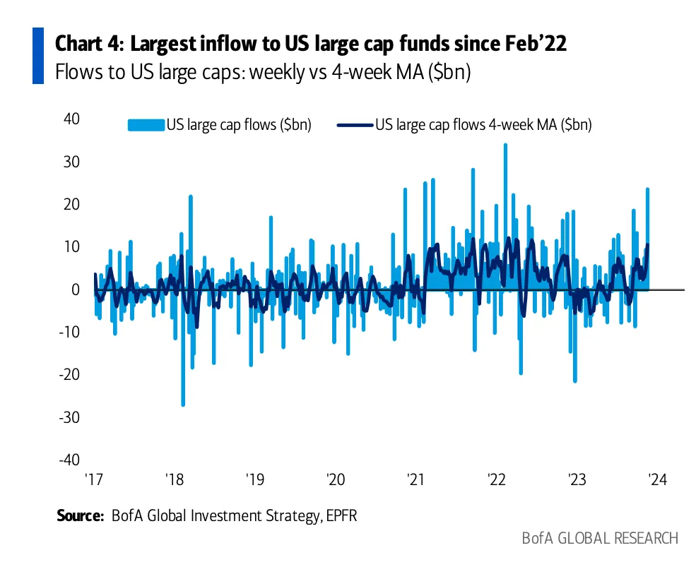 ¿Y a qué tipo de acciones se ha dirigido el dinero esta última semana? Victoria aplastante de la renta variable EEUU de gran capitalización, que ha registrado las mayores entradas netas desde hace un año y medio.