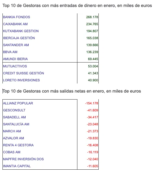 Os comparto las cifras de Inverco, tanto las gestoras con más entradas y salidas