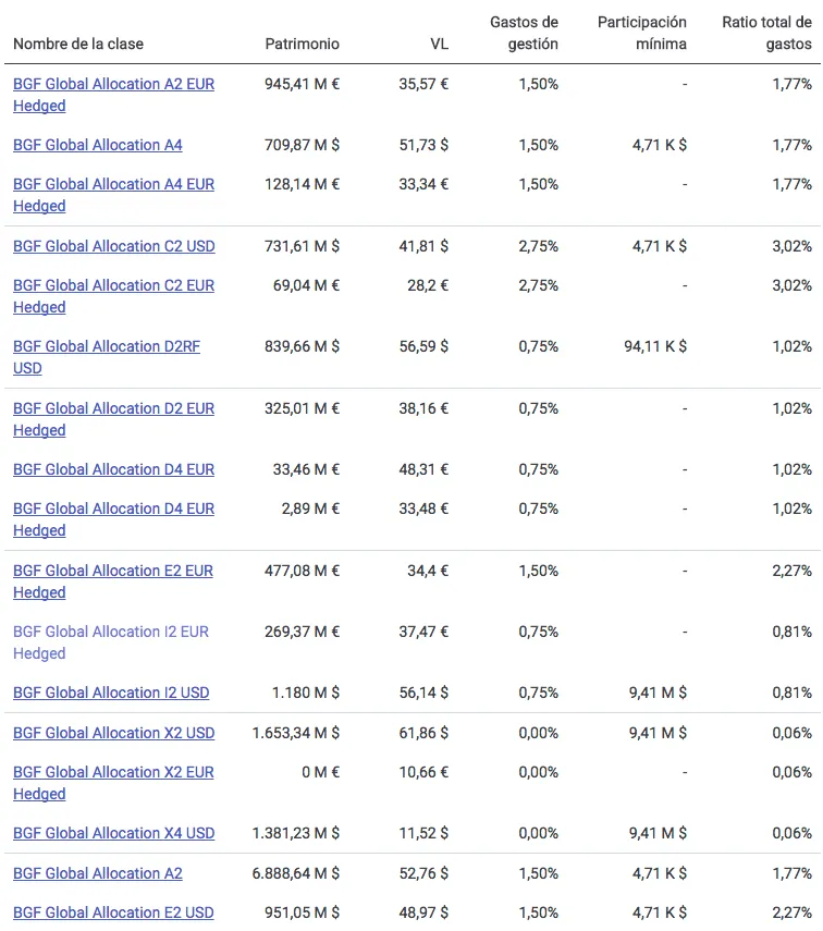 En Finect, buscando cualquier fondo de inversión, puedes encontrar las clases de ese mismo fondo, con la comisión y la inversión mínima solicitada por la firma para acceder a la misma. Para ello, tan sólo tienes que ir a la ficha de cualquier fondo (puedes encontrarlo en Fondos o en el buscador) y pinchar en la pestaña "Clases". Aquí puedes ver el ejemplo en la ficha del BGF Global Allocation.