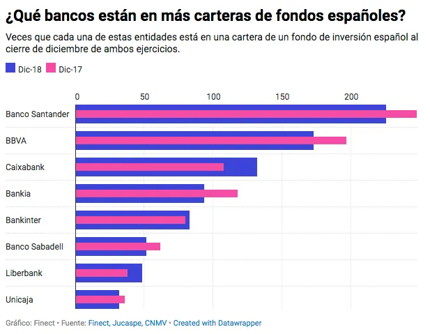Y lo mismo sucede si, en vez de fijarnos en el número de veces que se repiten, miramos el patrimonio que los fondos tienen en acciones de estas entidades. Esta cifra se redujo desde los 2.236 millones de finales de 2017 hasta los 1.632 millones de euros que las carteras tenían invertido en títulos del sector financiero nacional a cierre de diciembre de 2018.