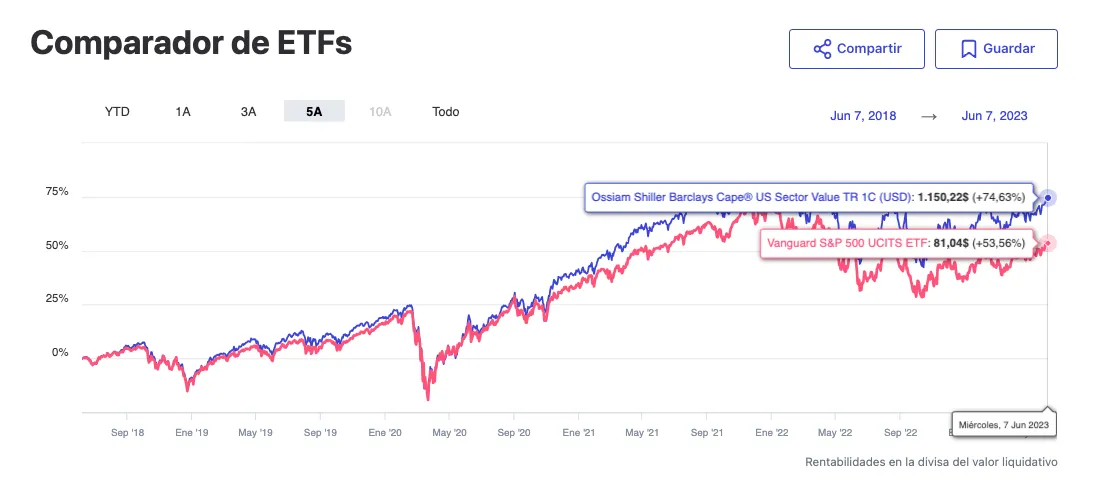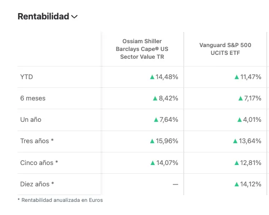¿Y qué tal va en rentabilidad? ¿Consigue superar al S&P 500? Desde que se tienen datos del ETF sí. A 5 años consigue una rentabilidad del 74%, frente al 54% del ETF sobre el Vanguard S&P 500, que es uno de los más cercanos a la evolución del índice, como se puede ver en nuestro comparador de ETFs.