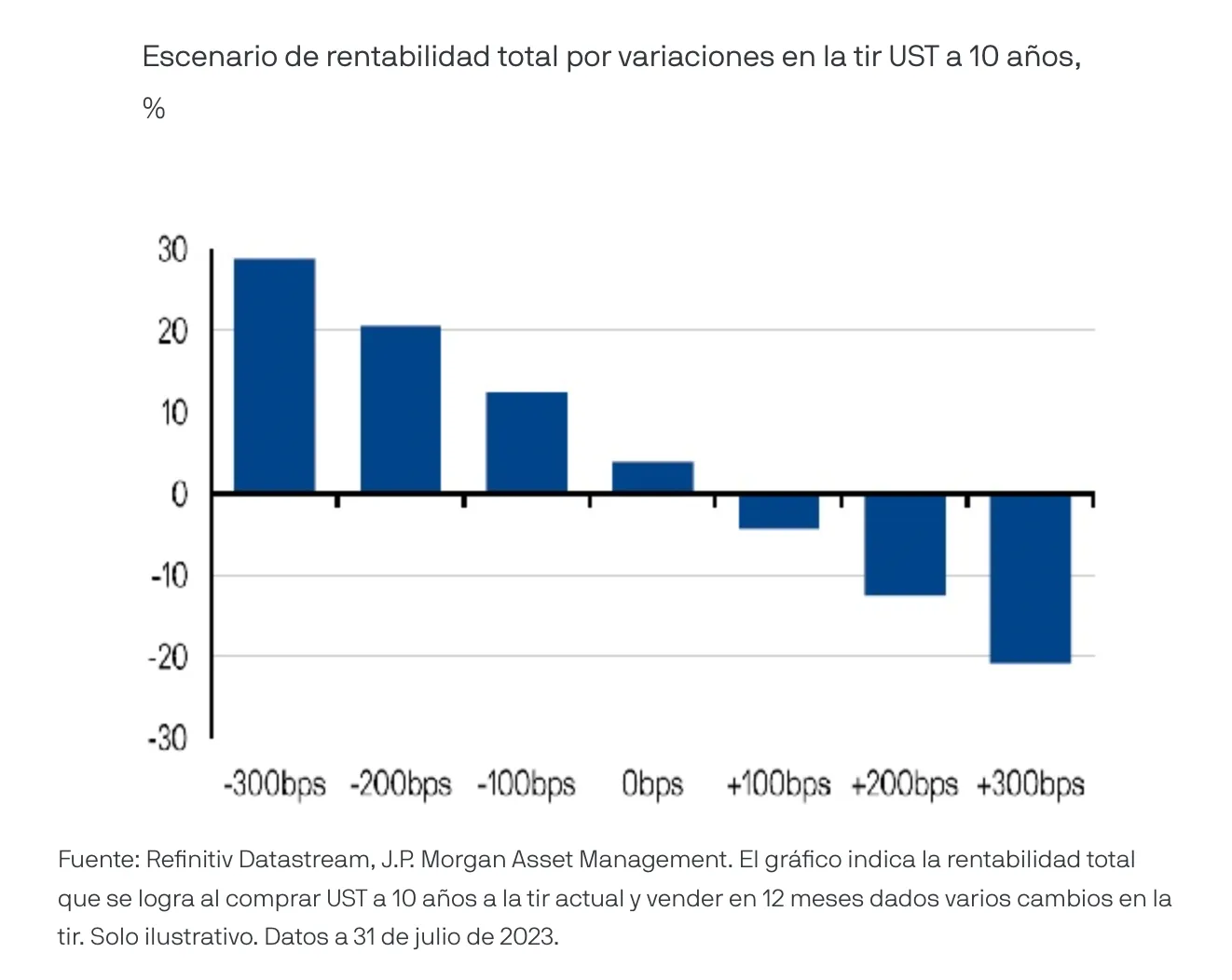 Como se puede ver, un movimiento a la baja de 100 puntos básicos (un punto porcentual) en el bono a 10 años en EEUU, podría suponer una subida del 10% aproximado en la posición. Si bajaran 200 puntos básicos, un 20%... Y 300, casi un 30%. En cambio, si hay un movimiento al alza de 200 puntos básicos se podría llegar a perder un 10% más y por encima del 20%, si la referencia a 10 años sube 300 puntos básicos.