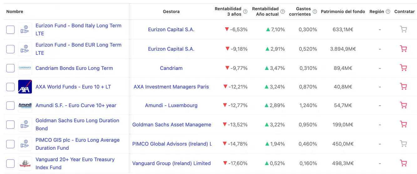 El fondo de Vanguard destaca por replicar sin más un índice de bonos de gobiernos de larga duración y que ha caído mucho estos 3 últimos años. Pero hay opciones más allá de los indexados dentro de esta categoría de bonos de gobiernos europeos de larga duración, aunque lógicamente con costes algo mayores, como los que podéis consultar en esta tabla.