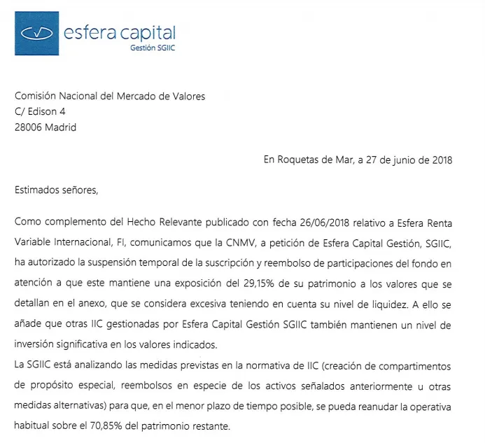"La CNMV ha autorizado con fecha de hoy, a petición de la entidad gestora Esfera Capital Gestión SGIIC, la suspensión temporal de la suscripción y reembolso de participaciones de los fondos de inversión Annapurna FI y Esfera Renta Variable Internacional FI, debido a la elevada exposición de su patrimonio en términos relativos a determinados valores (en relación con su liquidez) y teniendo en cuenta que siete SICAVs gestionadas por la propia gestora también mantienen un nivel de inversión significativa en los mismos valores. Estas SICAVs han solicitado igualmente la suspensión de su cotización.