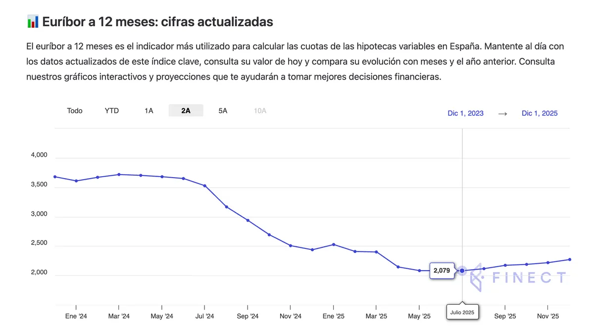 También se refleja este cambio de tendencia en la evolución del euribor a 12 meses, que además de para poner el tipo de interés en las hipotecas sirve para ver expectativas de tipos del mercado. Como se puede en el gráfico con la evolución del Euríbor en Finect, la media mensual ha ido mejorando desde el mínimo que tocó en julio en el 2,079%. Diciembre lo va a cerrar en el 2,27%. Pero no sólo eso. Hay más buenas noticias.