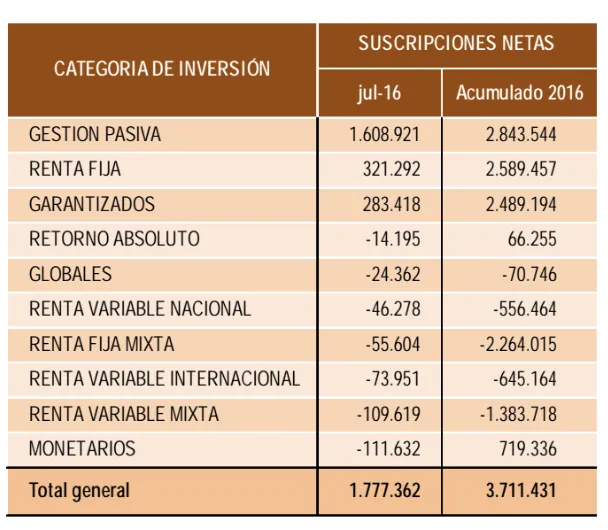 Me acaba de llegar el previo del informe mensual que elabora Inverco sobre la evolución de la industria española de fondos. Y me ha llamado poderosamente la atención que la categoría que más dinero captó en julio fue que la denominada de "Fondos de gestión pasiva", que en junio ha captado 1.608 millones de euros en neto y se ha convertido en la que más capta en el año, más de 2.800 millones de euros.