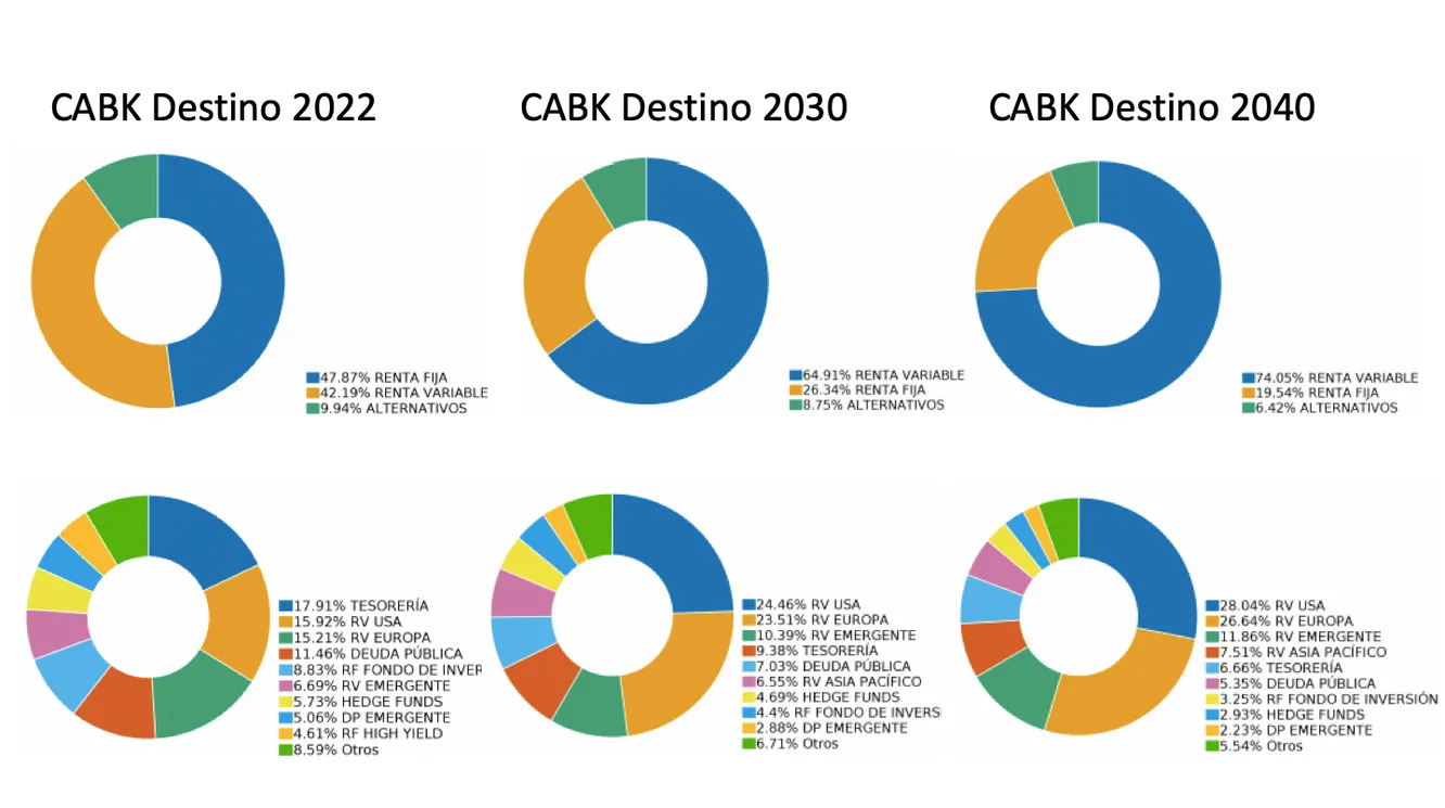 Como se puede ver, el CABK Destino 2022, pensado para los que se van a jubilar en 2022, tiene sólo un 42% en renta variable, mientras que el CABK Destino 2030 tiene un 65% en bolsa y el CABK Destino 2040, un 75%.