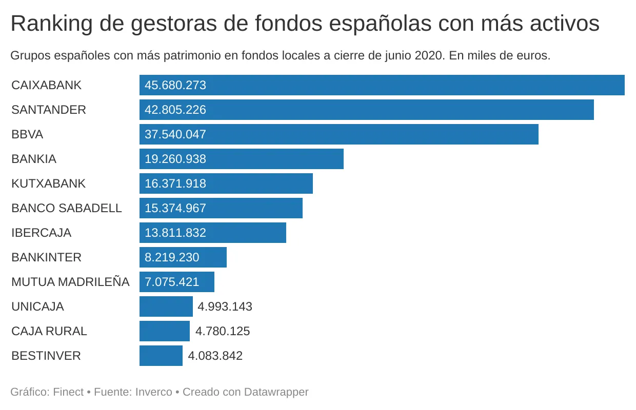 Así quedaría el ranking a cierre de junio. Como se puede ver, el liderazgo corresponde a Caixabank, que ha realizado en los últimos meses un tremendo movimiento del dinero de los clientes hacia sus nuevos servicios de carteras gestionadas: Caixabank Master y Caixabank Smart Allocation. Se ha distanciado así en casi 3.000 millones de euros de Santander Asset Managemente, al que superó en 2019 como líder por activos gestionados en fondos locales.