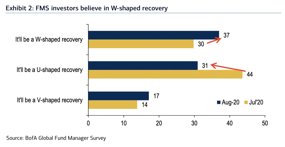 La mejora de la confianza también se percibe en la mejoría de las expectativas económicas y los resultados empresariales, aunque sin euforias. Baja el porcentaje de gestores que espera una recuperación en forma de U, la más dolorosa, y la mayoría la contempla en forma de W (37%), que implicaría una recaída en los próximos trimestres antes de la recuperación definitiva. Tan sólo un 17% la ven en forma de V.