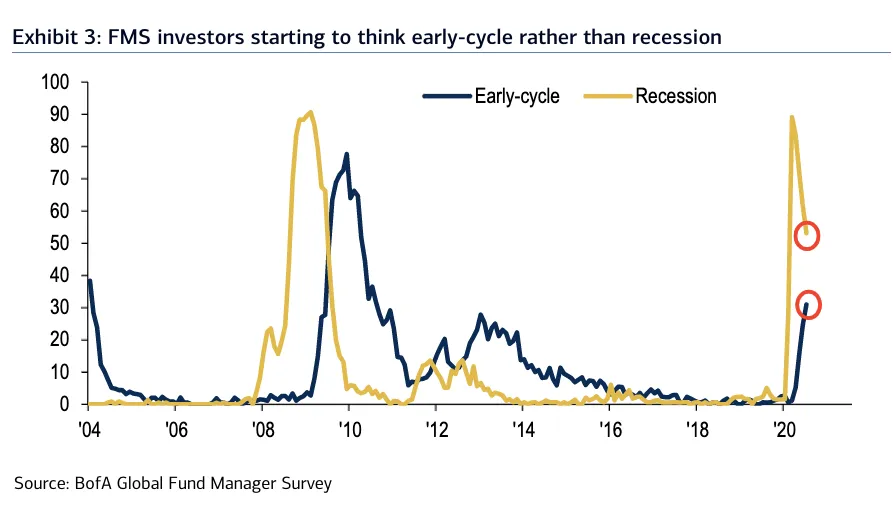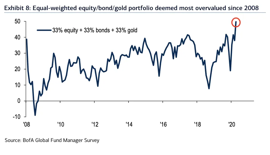 En realidad, esta mejora en el sentimiento viene acompañada de cautelas. Por ejemplo, respecto a los precios de los activos, lo cual es lógico después de que la recuperación del mercado bajista en la bolsa de EEUU haya sido la segunda más rápida de la historia. “Los gestores globales creen que los activos están caros”, explican desde Bank of America. De hecho, creen que una cesta equiponderada de renta fija, renta variable y oro estaría ahora mismo más cara incluso que en 2008, antes de iniciarse la gran crisis financiera.