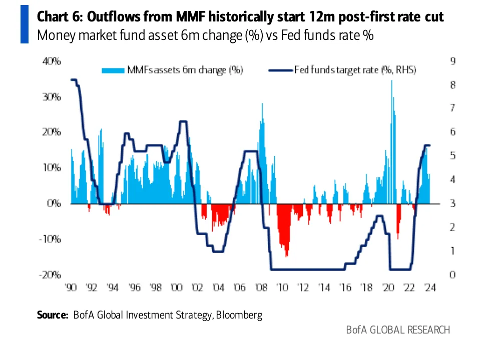 Y una vez que empiece a moverse, ¿cuánto de ese dinero irá a otros activos de más riesgo? Si aplicamos la historia, "las salidas de fondos monetarios en los últimos 5 ciclos fueron equivalentes al 20% de los ingresos anteriores", explican los estrategas de Bank of America. Esto equivaldría a unos 250.000 millones de dólares de efectivo en esta ocasión que buscarían destino en los activos de riesgo.