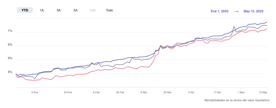 Lo más normal es que este tipo de fondos obtenga la rentabilidad de las letras del tesoro de 12 meses menos las comisiones de gestión y depositaría. De momento, en lo que llevamos de 2023, los 3 productos mencionados ganan cerca de un 0,7%.