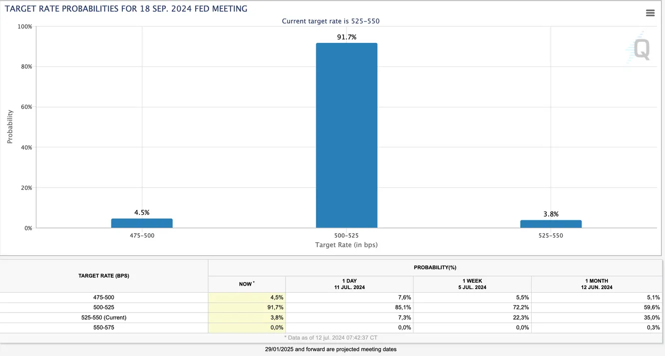 En el mercado de futuros de CME, se ha disparado por encima del 90% la probabilidad de que haya un recorte de un cuarto de punto desde el nivel actual de 5,25%-5,50%.