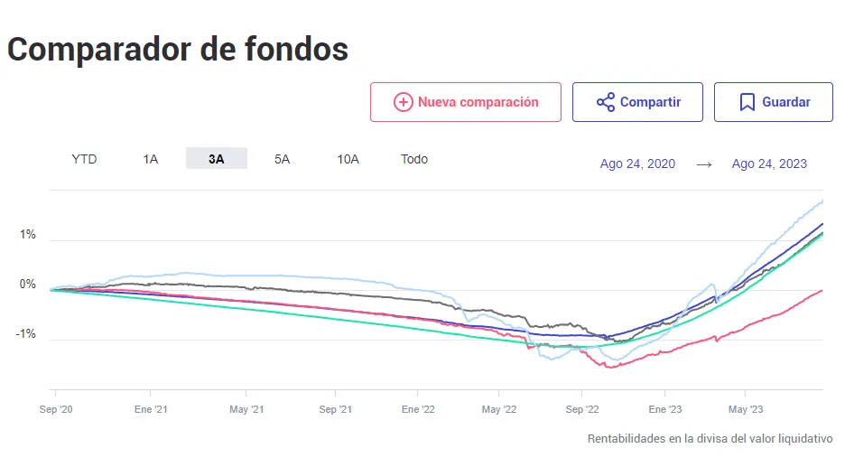 Si medimos su evolución en rentabilidad en nuestro comparador de fondos, se puede ver que a un plazo de 3 años, el más rentable ha sido precisamente el DWS Floating Rate Notes, pero también ha sido el que más ha llegado a caer a lo largo del tiempo.