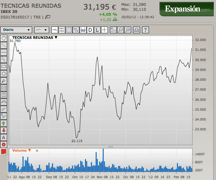 He visto que las veces que ha intentado rebotar se ha acabado frenando cerca de los 30 euros. No había manera de superarlos. Hoy, en cambio, sube con fuerza, más de un 4% a la hora que escribo esto, y supera esos niveles que tanto le ha costado, para irse a 31,19 a esta hora.