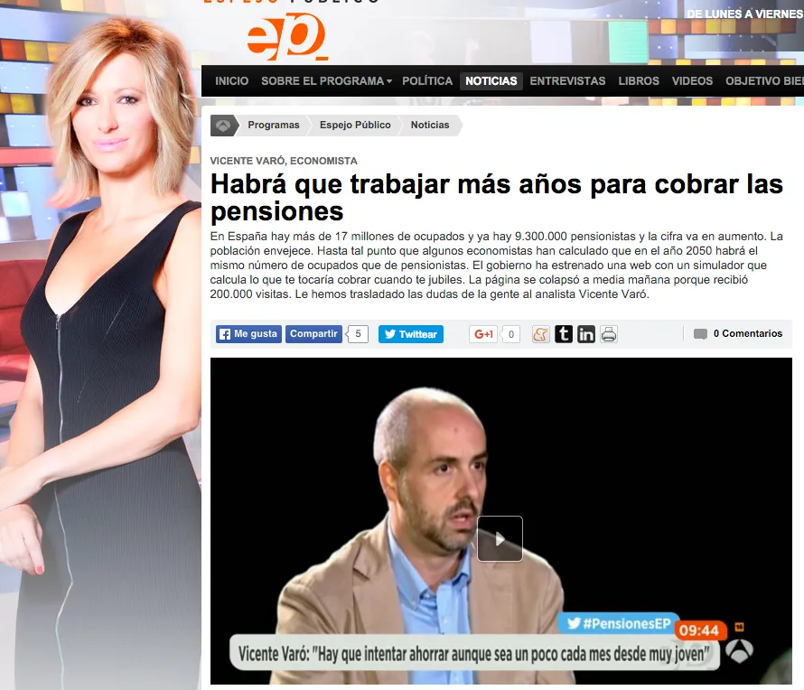 Hace unas semanas asistí en calidad de 'experto', fíjate tu, al programa Espejo Público de Antena 3, que presenta Susanna Griso. Estaban haciendo un reportaje a raíz de la nueva web lanzada por la Seguridad Social para que cada ciudadano pueda consultar cuanto está previsto que cobre al jubilarse.