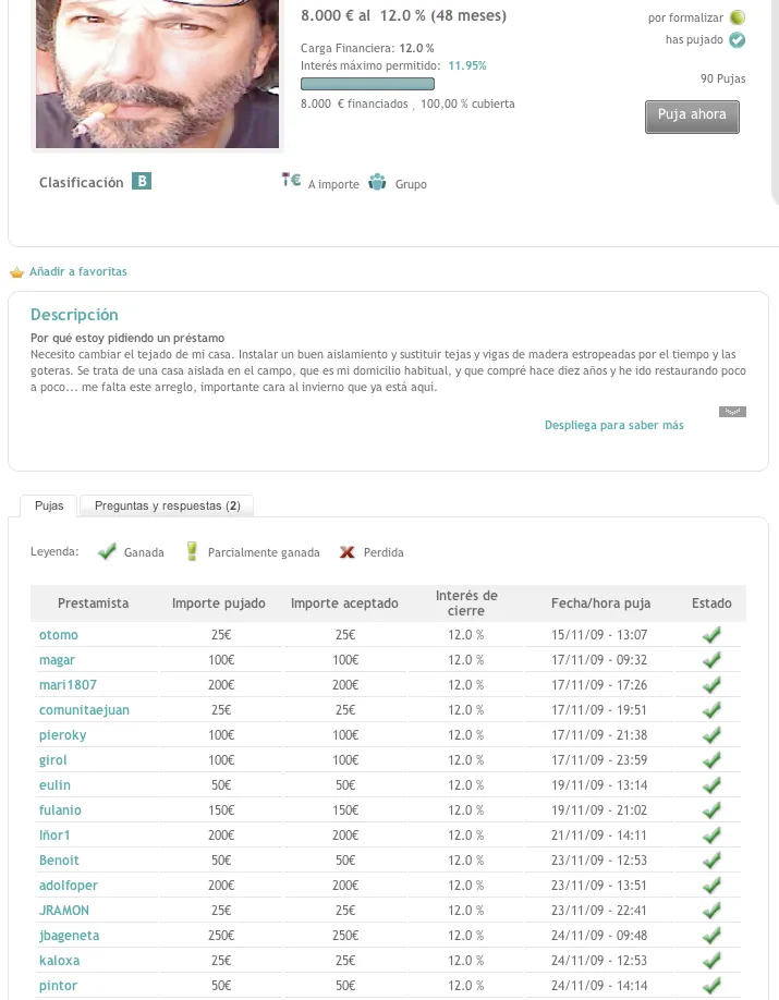 El usuario que había pedido el préstamo decía quererlo para hacer unas reformas en el tejado de su casa, sobre todo ahora que llega el frio. Y la subasta se ha cerrado con un tipo de interés del 12 por ciento. Os muestro más abajo el cuadro de la puja, en el que si os fijáis al final de todo aparece un tal Kaloxa.