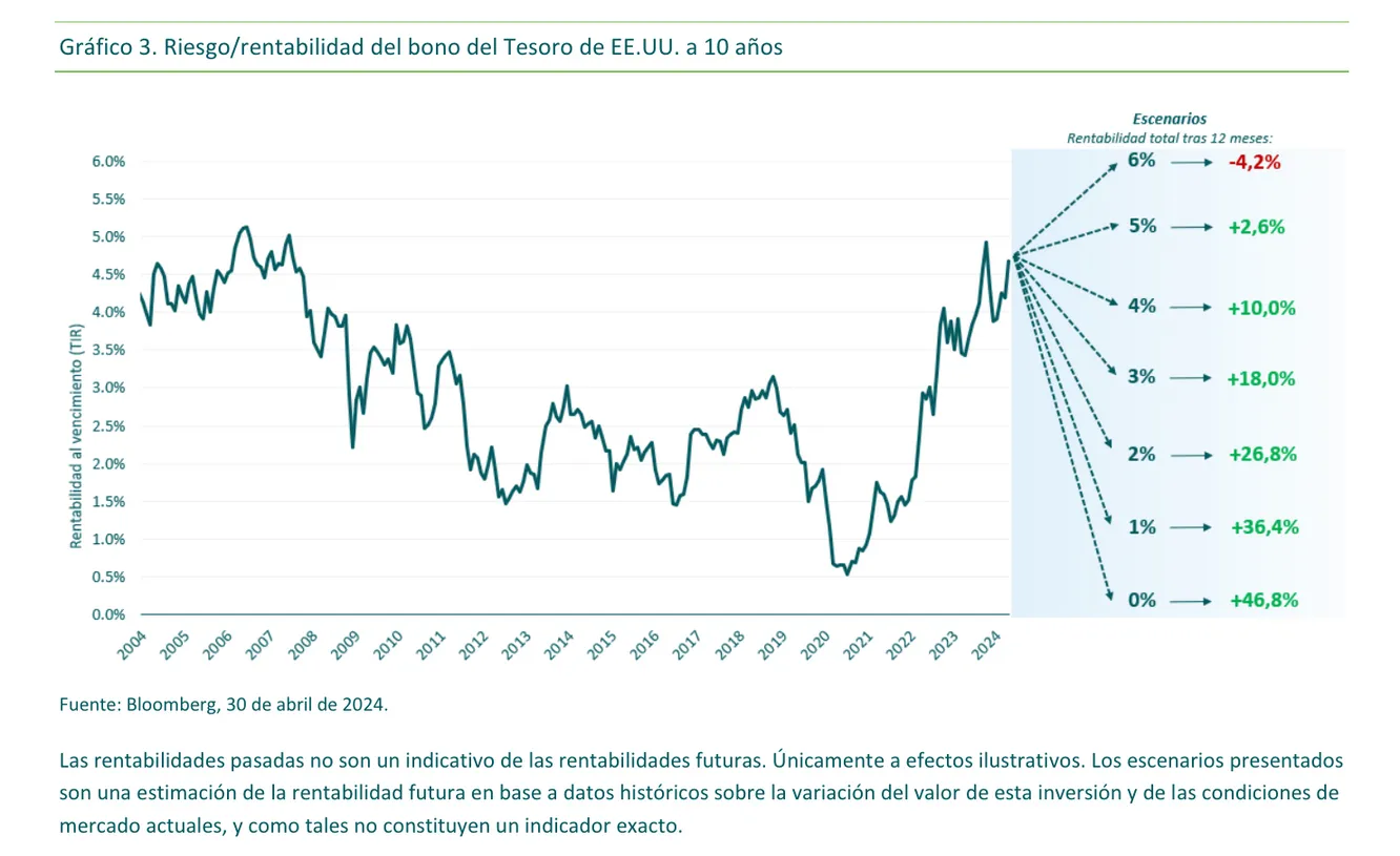 Se puede ver en este gráfico de M&G, que indica la rentabilidad esperada en función del tipo de interés actual y de lo que pueda pasar con los tipos de interés. En este caso, sobre el bono de EEUU a 10 años, pero sería relativamente parecido en Europa.