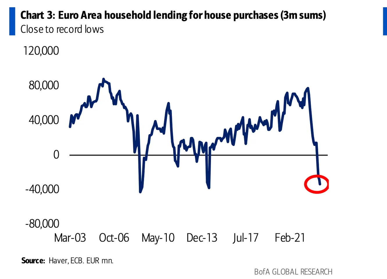 El BCE ha frenado el endurecimiento monetario porque la economía europea se está debilitando con intensidad. Sólo ver la velocidad de la caída en la concesión de créditos para la compra de vivienda invita a la prudencia sobre el crecimiento económico.
