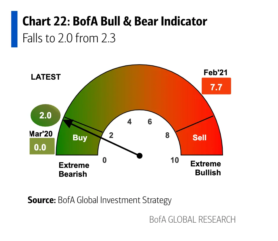 Hay distintos índices de sentimiento contrario, pero uno de los más populares lo tiene Bank of America y lo publica cada semana en su informe semanal de flujos de fondos.