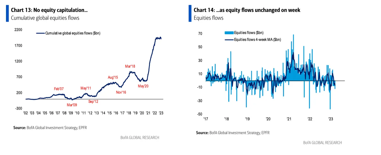 Esta tranquilidad de los inversores con las acciones se está viendo reflejada también en los movimientos de dinero. En la suma de las últimas dos semanas, incluso ha habido entradas en renta variable, según los datos de EFPR que recoge en su informe semanal de mercados Bank of America, cerca de 2.500 millones de dólares.