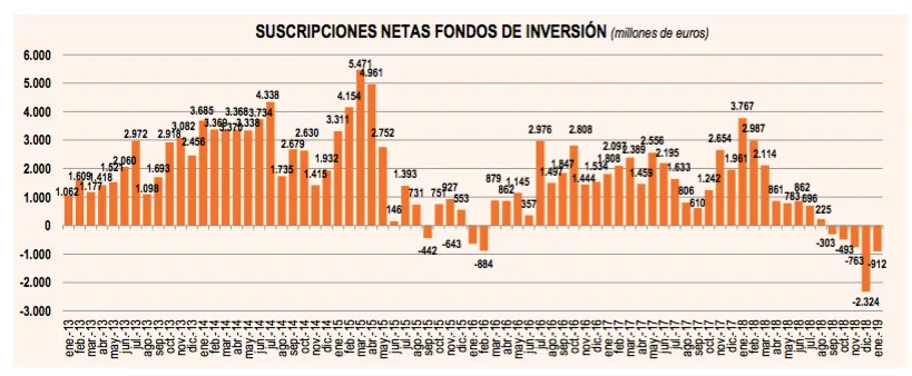 El sudor frío que muchos experimentaron en sus carteras durante el último trimestre de 2018 sigue teniendo consencuencias en el ánimo inversor. En enero, hubo reembolsos netos (entradas menos salidas de dinero) por 912 millones de euros de los fondos de inversión españoles, de acuerdo con los datos preliminares de Inverco, la asociación del sector.