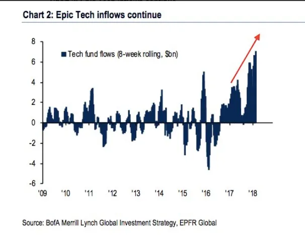 En tecnología los flujos siguen siendo "épicos", como decían hace unas semanas desde BoA, en el titular acompañando este tremendo gráfico.