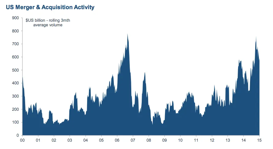 En una de las presentaciones, relativa a la evolución de las bolsas y renta fija de EEUU, se ha compartido este gráfico sobre el volumen de compras y fusiones entre compañías.