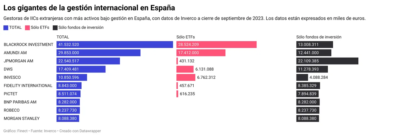 Si dejáramos fuera de la ecuación los ETFs, el liderazgo de las gestoras internacionales por activos bajo gestión en España lo ostenta JPMorgan AM, que, según los datos de Inverco, eleva el patrimonio bajo gestión en el país hasta 22.109 millones de euros en fondos (a los que habría que sumar 431 millones de euros en ETFs).