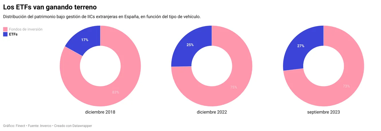 Hace 5 años, a finales de 2018, el peso de los ETFs era inferior al 17%. En los primeros 9 meses de 2023 habría aumentado más de 1,5 puntos porcentuales, ya que en diciembre de 2022 se situaba en el 25,3%.